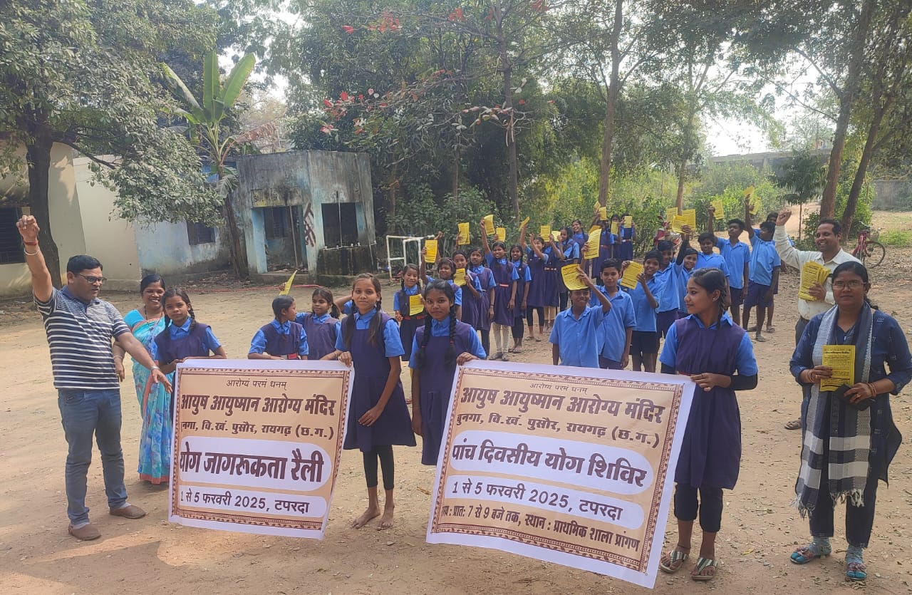 रायगढ़। 5/2/25 आयुष संचालक इफ्फत आरा आईएएस के आदेशानुसार जिला आयुष अधिकारी डॉ गौराहा सर के मार्गदर्शन में प्रभारी डा अजय नायक के नेतृत्व में टपरदा में 1 से 5 फरवरी तक प्रतिदिन सुबह 7 से 9 बजे तक योग प्रशिक्षक डुलामणि रजक द्वारा विभिन्न आसान जैसे वृक्षासन, पवन मुक्तासन, मंडूकासन, भ्रष्टिका,भ्रामरी अनुलोम विलोम प्राणायाम, नौकासन, त्रिकोणासन वज्रासन भुजंगासन सूर्य नमस्कार इत्यादि अभ्यास करवाया गया डॉ अजय नायक ने बताया की टपरदा में कुल 415 लोगों ने योग शिविर का लाभ उठाये। सुख शांति एवम् समृद्धि के लिए प्रतिदिन एक घंटे योगासन ज़रूरी है योगासन के द्वारा विभिन्न रोगों से मुक्ति में सहायता मिलती है कार्यक्रम में रोग प्रतिरोधक क्षमता बढ़ाने हेतु गुडुची काढ़ा, अंकुरित चना एवम् योगा संबंधित पंपलेट वितरण किया गया जिसमें फार्मासिस्ट भोज मालाकार एवम् राजेश साव का सक्रिय योगदान रहा।।