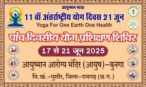 बुनगा ,पुसौर।।आयुष संचालक शिखा राजपूत (आई ए एस) के आदेशनुसार एवं जिला आयुष अधिकारी डॉ गौराहा के मार्गदर्शन में आयुष्मान आरोग्य मन्दिर आयुष के प्रभारी आयुर्वेद चिकित्सा अधिकारी डॉ अजय नायक के नेतृत्तव में 11 वा अंतर राष्ट्रीय योग दिवस 21 जून के उपलक्ष्य में पांच दिवसीय योग शिविर 17 से 21 जून तक बुनगा के माध्यमिक विद्यालय में प्रातः 5 से 7 बजे तक योग प्रशिक्षक दुलमानी रजक के द्वारा योगाभ्यास करवाया जायेगा इस शिविर हेतु पोस्टर पंपलेट एवं कोटवार द्वारा मुनादी करवा कर सघन प्रचार प्रसार किया जा रहा है