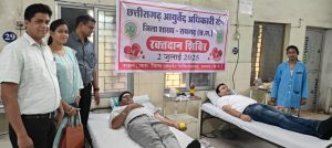 पुसौर।।छ ग आयुर्वेद अधिकारी संघ रायगढ़ के तत्वाधान में शासकीय जिला आयुर्वेद चिकित्सालाय मे रक्त दान शिविर का आयोजन किया गया जिसमें कुल 20 यूनिट रक्त दान किया गया। जरूरत मंद लोगों को उचित समय पर रक्त ब्लड बैंक में मिल सके।रक्त दान एक अनूठी पहल है जिसे आयुर्वेद अधकारी संघ ने पहल कर आयोजित किया।